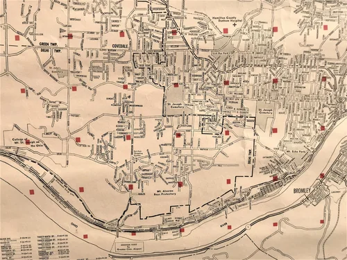 This city transportation map was featured in a folding map titled, “A New Map of Cincinnati, Historical & Pictorial.” It was published by The Cincinnati Pictorial Map Company in 1942.