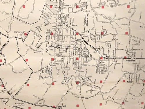 The map also shows Cincinnati’s original street car routes. By 1951, many cities had already phased out their streetcar systems in favor of buses, trolleys, and automobiles. However, Cincinnati’s streetcar system remained one of the most extensive in the nation, spanning approximately 220 miles of track at its peak. The last streetcar (version 1.0) ran on April 29, 1951, marking the end of an era for transportation in the Queen City.