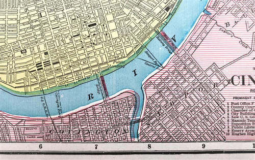 It was due to the surge in population during this time that a charter was formed by the Kentucky legislature which granted funds to a young German-born civil engineer named John Roebling for the proposes of building a bridge that would connect Cincinnati to Covington, Kentucky. John Roebling’s suspension bridge would not be completed for another 29 years after the publication of this map.